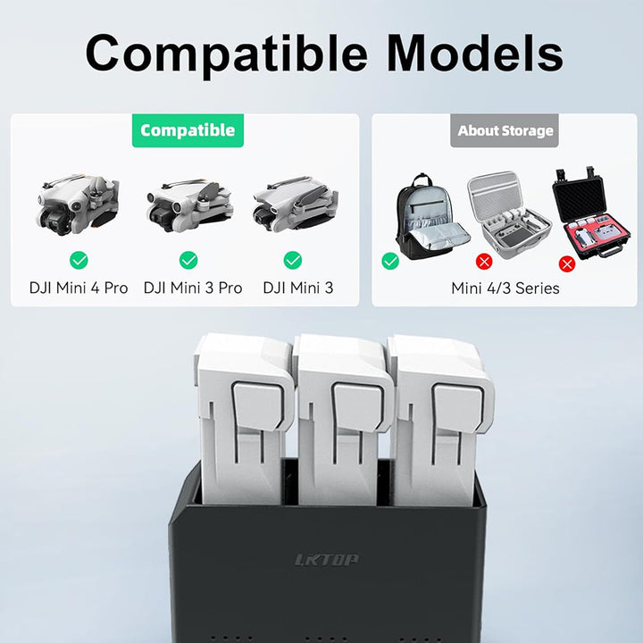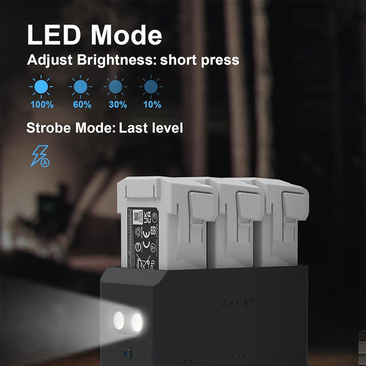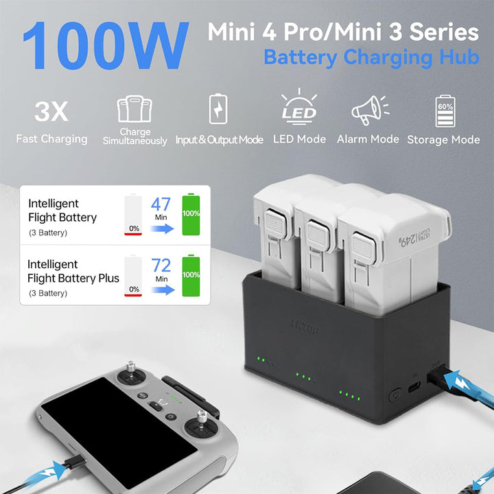 - โก๏ธใ๐๐ป๐ฝ๐๐ & ๐ข๐๐๐ฝ๐๐ ๐ ๐ผ๐ฑ๐ฒใFunction: Charge 3 batteries at the same time or simultaneously charge battery and DJI remote controller/phones/Ipad (some other devices with USB-C port) ; Charging Time: 47 min (for 3 Intelligent Flight Battery); 72 min (for 3 Intelligent Flight Battery Plus).