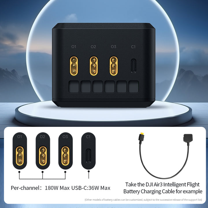- ใ๐ฆ๐ถ๐บ๐๐น๐๐ฎ๐ป๐ฒ๐ผ๐๐ ๐๐ต๐ฎ๐ฟ๐ด๐ถ๐ป๐ดใThe Air 3/Air 3S Battery Charging Hub supports a maximum input power of 200W. It is recommended to use it with two LKTOP 100W Battery Chargers. The Air 3 Series Battery Charging Hub prioritizes charging the battery with the highest remaining power and can simultaneously charge three DJI Air 3 Series intelligent flight batteries. It can also charge batteries and remote controllers at the same time, saving time and being efficient.