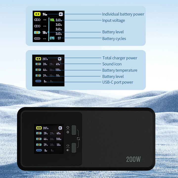 - ใ๐๐๐ ๐๐ถ๐๐ฝ๐น๐ฎ๐ ๐ฆ๐ฐ๐ฟ๐ฒ๐ฒ๐ปใWith this 200W Air 3 Series Charging Hub for DJI Air 3/Air 3S Battery, you can clearly view information such as voltage, capacity, temperature, cycle count, power, etc. (C/V CAP TEMP PWR CYC) for each battery, allowing you to precisely manage your DJI Air 3 Series intelligent flight batteries.